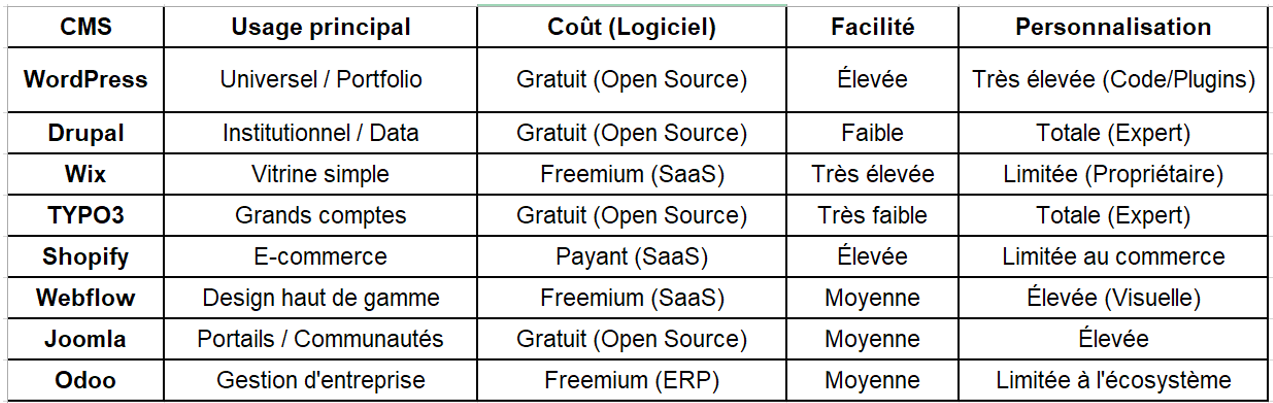 Tableau comparatif des différents CMS :