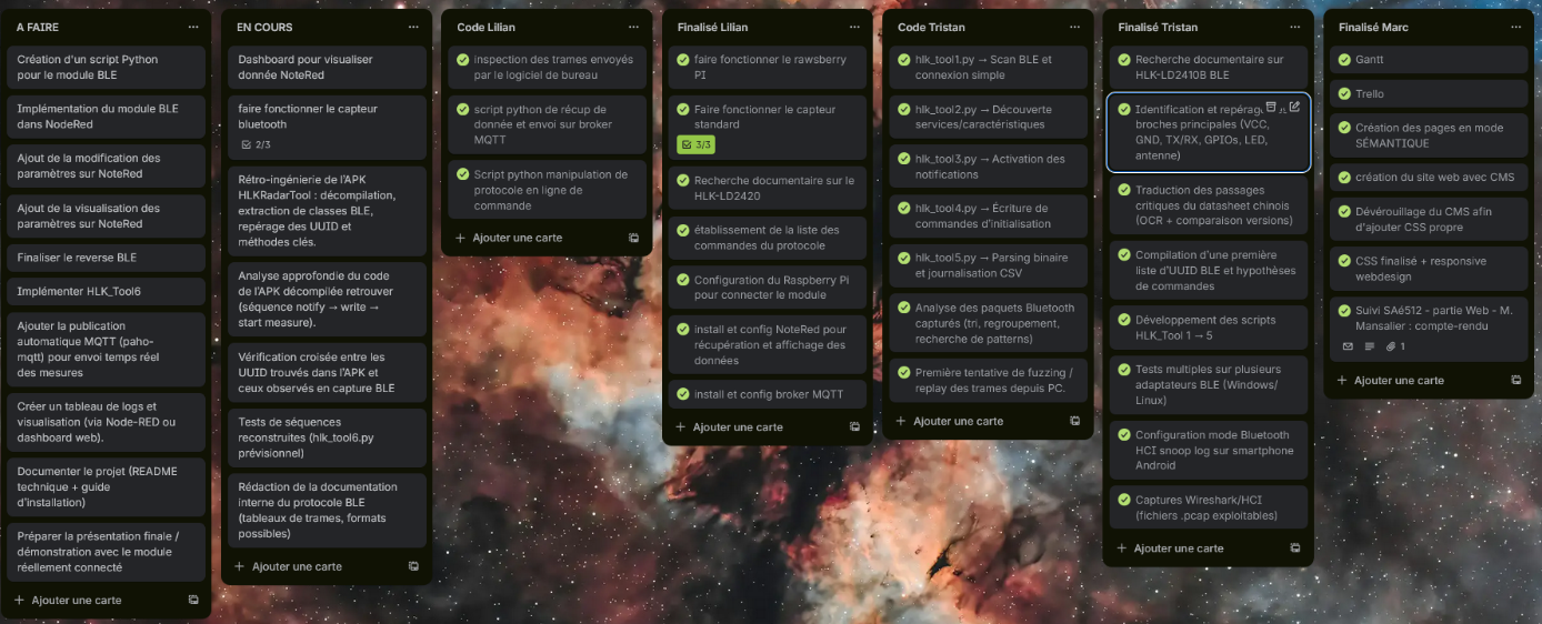 Familiarisation avec le matériel radar 24 GHz, recherche et étude de la documentation technique, compréhension des protocoles de communication (série, BLE, MQTT) dans leur ensemble.